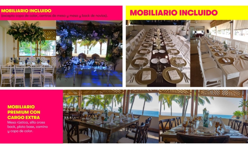 - Mobiliario Premium desde $495.00 pesos por persona (mesa madera y silla cross back)